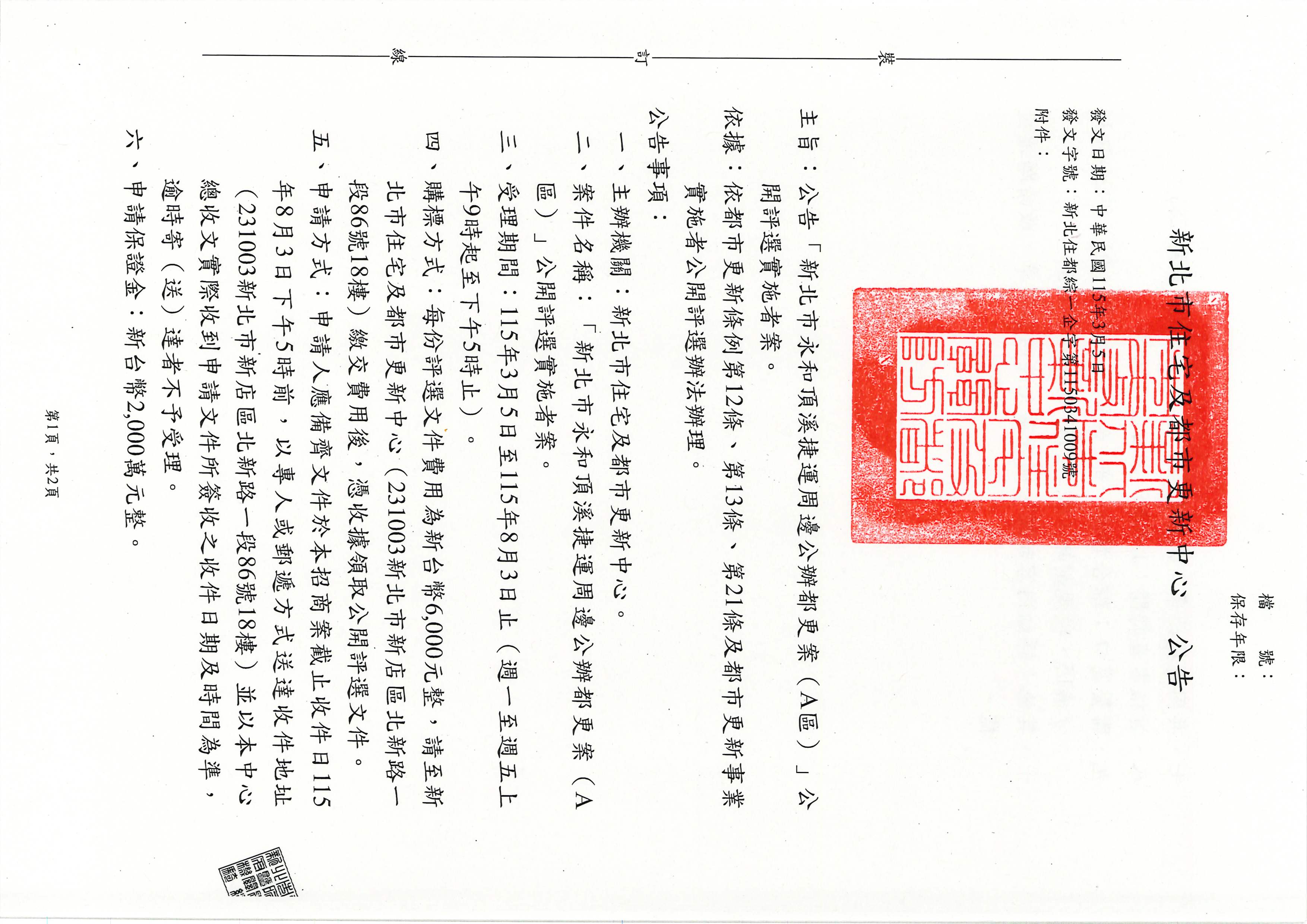 「新北市永和頂溪捷運周邊公辦都更案(A區)」公開評選實施者案。